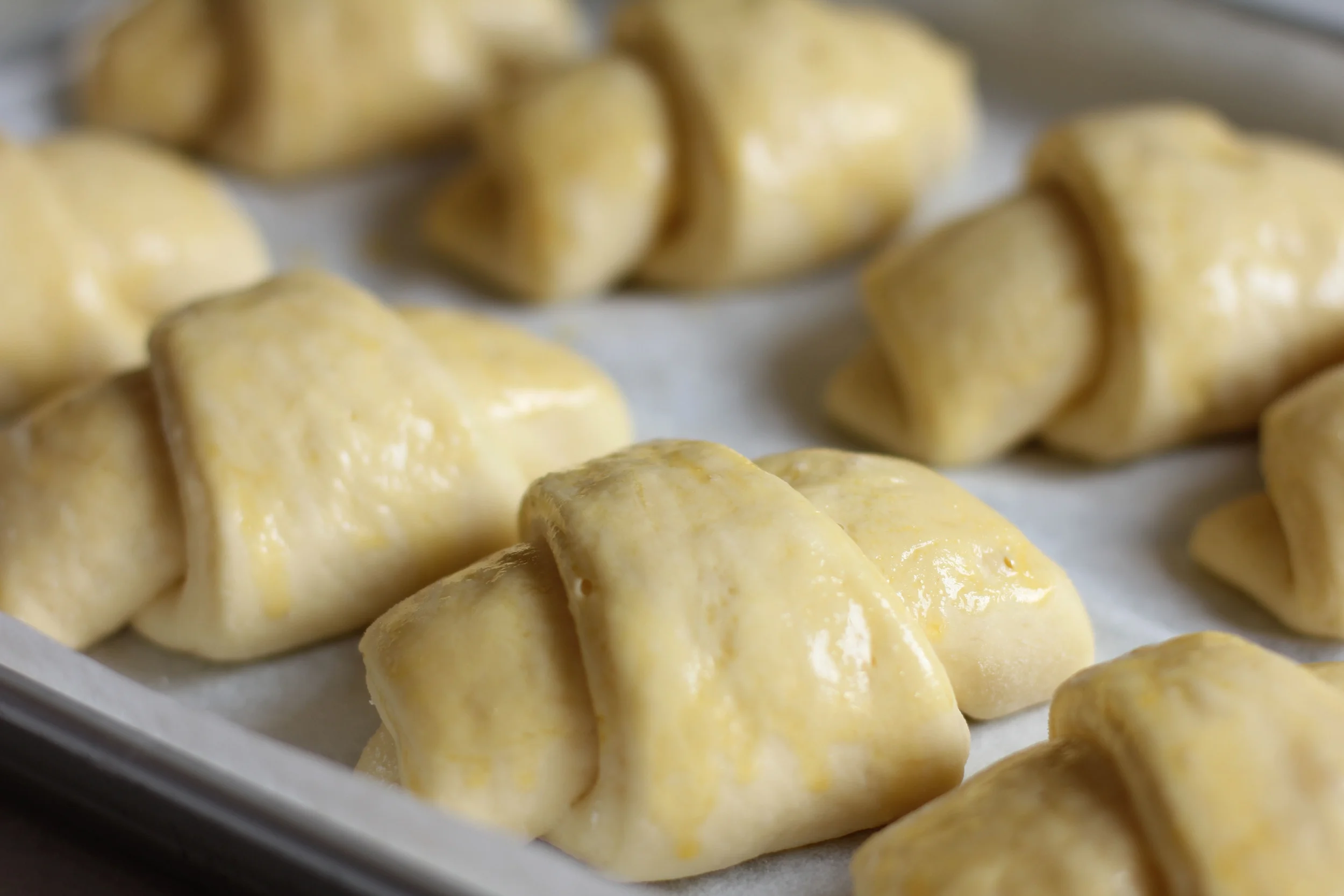 I am very new at baking bread, although I adore the smell every time I walk pass a bakery that serves freshly baked bread, sometimes I am just too lazy to bake my own. But after a recent bread baking session with one of my mentors, I am a convert. Nothing beats freshly home baked bread. Especially when you egg wash everyone of them before throwing it into the oven for them to bake themselves, omg I can't even. Being one who always emphasises on aesthetic as one of the important element whenever it comes to things I make, or things I use (weakness of woman much? that explains why I make sure the cakes I do have an aesthetically pleasing outlook, albeit of course, the cake possessing the right taste and texture), I came to take a liking for the shape of butterhorn rolls/ croissants/ wassants, and boom, there I go.
